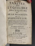 PASCAL (Blaise). Traitez de l'équilibre des liqueurs, et de la pesanteur de la masse de l'air. À Paris, en la boutique de C. Savreux, chez G. Desprez, 1664. In-12, [13] f., 232 p., [3] f., pl., fig., veau brun époque, dos à 5 nerfs, titre doré,...