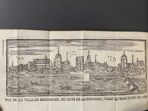 p.233-503, pl., demi-basane fauve début XIXe s., dos lisse, pièce de titre saumon, filets dorés, tranches jaunes (discret accroc au bord d'une coiffe). Rare édition originale du premier livre imprimé à Beaugency. Elle est illustrée d'une grande planche dépliante gravée sur bois, offrant un panorama de la ville, côté sud au-delà de la Loire, « telle qu'elle étoit en 1789 ». Le tirage fut limité à 450 exemplaires, et peu d'exemplaires sont toujours conservés, dont certains privés de la planche qui en fut souvent extraite. Cet exemplaire conserve la trace, à la fin du tome 1, de 4 feuillets supprimés par l'auteur lui-même, à la suite de ses démêlés avec les autorités parisiennes.