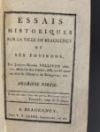 [Beaugency]. PELLIEUX (Jacques-Nicolas). Essais historiques sur la ville de Beaugency et ses environs. A Beaugency, chez P. P. Jabre, an VII - an IX [1798-1801]. Deux tomes en un volume in-12, [2] f., XII-232 p., [1] f. (additions) ; [2] f., IV p.,...