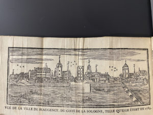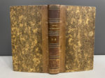 p.233-503, pl., demi-veau havane XIXe s., dos lisse, pièces de titre et de tomaison, filet dorés et noirs (dos un peu frotté, petite fente en tête du mors sup., pâle mouillure en marge de qq. ff. à la fin du t.1). Rare édition originale du premier livre imprimé à Beaugency. Elle est illustrée d'une grande planche dépliante gravée sur bois, offrant un panorama de la ville, côté sud au-delà de la Loire, « telle qu'elle étoit en 1789 ». Le tirage fut limité à 450 exemplaires, et peu d'exemplaires sont toujours conservés, dont certains privés de la planche qui en fut souvent extraite. Exemplaire relié avec toutes ses marges.
