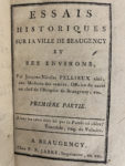 [Beaugency]. PELLIEUX (Jacques-Nicolas). Essais historiques sur la ville de Beaugency et ses environs. A Beaugency, chez P. P. Jabre, an VII - an IX [1798-1801]. Deux tomes en un volume in-12, [2] f., XII-232 p., [1] f. (additions) ; [2] f., IV p.,...