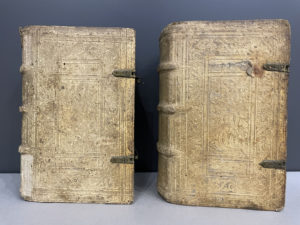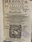 pleine peau de truie sur ais de bois, de facture similaire, dos à 3 nerfs doubles, plats décorés à froid d'un jeu de filets et roulettes florales, fermoirs (frottements, des coins émoussés, mouillures claires sporadiques, rousseurs). 1. Sermonum dominicalium, ex Epistolis et Evangeliis totius anni. Pars aestivalis [seule, sur 2 parties publiées]. 1591. [8] 367 f. (USTC 847454). 2. Sermones de imitatione sanctorum, pro illorum diebus festis, qui toto anno in Ecclesia celebrantur. 1594. [16]-591-[1] f. (USTC 847458). Provenance : Christoph Keller (ex-libris ms. ancien au titre) ; autres ex-libris ms. anciens aux contreplats ; Dominicains de Poitiers (cachets modernes).