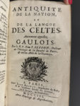de titre, caissons ornés, roulette aux coupes, tr. jaspées. Livre « peu commun » selon Nodier, rare selon Fournier (1809). C'est l'un des premiers essais de recherches historiques basées sur la linguistique, oeuvre de P.-Y. Pezron, religieux breton (vers 1640-1706).
