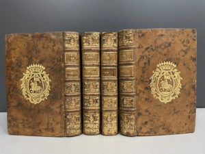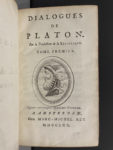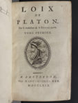 [Reliure aux armes]. PLATON. Loix. [Et] : Dialogues. Par le traducteur de La Républiques. A Amsterdam, chez Marc-Michel Rey, 1769-1770. Deux ouvrages en 4 volumes in-12, vignettes gravées aux titres, veau havane moucheté époque, dos à 5 nerfs,...
