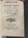 [POINSINET de SIVRY (Louis)]. Origine des premières sociétés des peuples, des sciences, des arts et des idiomes anciens et modernes. A Amsterdam, et se trouve à Paris, chez Lacombe, 1779. In-8, [2] f., 612 p., 3 fig. gravées sur bois dans le...