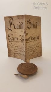- Document daté de 1752, in-4 oblong (dim. 37x23cm) sur vélin, en langue allemande, avec cachet en bois, pliures.