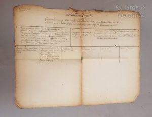 Document généalogique manuscrit sur les ancêtres de Pierre François Orsini. Le document porte le cachet du Cabinet d'Hozier et possède quelques corrections de la main de ce dernier (1 page, in-4).
