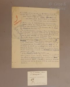 Il est joint un amusant manuscrit de 5 pages de Maurice Dekobra destiné à la publication concernant l'image donnée par les romanciers français et étrangers, à la famille, dans chacun de leur roman. Petite déchirure semble-il sans manque au début du premier feuillet.