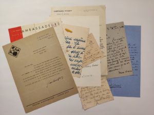 fait plaisir pour vous et pour [Georges] PITOEFF, qui l'interprète aussi bien qu'il est possible. Et mon plaisir aurait été sans mélange su je n'avais pas aimé votre oeuvre au point qu'il m'est difficile de ne pas garder un peu de regret de ne pas l'avoir connue. () » ; BELL (Marie) Lettre signée avec quelques corrections autographes Paris (s.d.). 1 p1/2. Gd in-4. En-tête du Théâtre des Ambassadeurs. Elle lui donne son avis sur la méthode de travail a adopter lors des répétitions « Il est détestable que les comédiens reçoivent des indications contradictoires de trois personnes différentes. () Aussi, si comme il est parfaitement naturel, vous avez des observations à faire sur l'interprétation ou la mise e, scêne, il me parait préférable que vous me le communiquiez, ainsi qu'à Geoffroy, soit à la fin de la répétition soit à l'interruption. () » ; MORLAY (Gaby) Lettre autographe signée (s.l.n.d.) « le 1er jour de juillet». 2 pp ½. in-4. Bel en-tête gravé représentant un dirigeable. Elle a lu La Sauvage (1934) « () je l'aime. Quand vous serez à Paris nous en parlerons () » ; NEVEUX (Georges) carte postale en partie autographe signée, Nice, 14 janvier 1941. 2 pp. in-12 oblong. Il annonce la naissance de sa fille Noëlle, et se remet à travailler ; PASTEUR VALLERY-RADOT (Louis) Lettre autographe signée, Paris, 23 novembre 1967. 1 p. gd in-4. En-tête de l'Académie Française. Il le complimente pour L'Alouette « C'est merveilleux ! tout est splendide () » ; PITOËFF (Georges) Lettre signe, Paris, 24 juillet 1937. 1 p. gd in-4. En-tête de la Compagnie Pitoëff - Théâtre des Mathurins. Il indique l'ordre des pièces « Je mettrai en répétitions LE SAUVAGE après L'ECHANGE et j'espère pouvoir passer avec cette pièce fin septembre, premiers jours d'Octobre. » Il lui annonce avoir commencé sa mise en scène et souhaite savoir si il y aura des modifications à apporter. Il lui demande des bonnes adresses au bord de la mer et conclut « () tâchez de ne pas partir en croisière sans me voir un court instant au sujet des distributions éventuelles () » ; PRINTEMPS (Yvonne) Carte autographe signée, Paris, (s.d.). 2 pp. in-16, en très mauvaise état (quasiment illisible). Elle donne de ses nouvelles, la suite est décousue « () il était heureux de jouer la pièce et triste - tout est atroce - Je vous aime bien - je vous embrasse de tout mon coeur () » ; ROSTAND (Maurice) Lettre autographe signée, Paris (s.d.) 2 pp. il recommande un « () jeune artiste André Maillol qui joue en ce moment dans « L'Aiglon » () » ; SALACROU (Armand) 4 Lettres autographes signées, Courval, Paris et Le Havre, (s.d.) 6 pp. in-8 et in-Folio. Le havre, il annonce « Oui, nous pourrions très bien nous connaitre, et nous nous connaitrons, j'espère, à la rentrée. () » il lui indique ses lieux de résidence et espère le voir dès son retour à Paris. Les deux lettres rédigées de Courval traitent du même sujet : une comédienne amie de Anouilh « colporte des propos explosifs », il essai de lui faire deviner son identité « C'est une comédienne amie de votre femme et de vous, et qui joue dans ma pièce () » ; Paris, il joue beaucoup et souhaite voyager, ce reposer, il indique à Anouilh que leurs femmes s'arrangeront pour « nous réunir ».