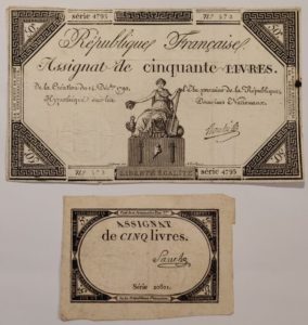 ASSIGNATS. 2 documents. 2 assignats l'un de cinq livres, le second de cinquante livres. Les deux documents en très bon état.