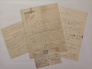 Il s'excuse, il ne s'est pas réveillé et propose un nouveau rendez-vous ; Carte postale de Bordeaux, dans laquelle il évoque sa "(...) Tournée (...) 2 jours inoubliables. Le tour que l'on a fait était touristiquement fort bien choisi, commercialement moins bien (...)" ; Le 4 mars 1933, fait part à son ami de ses déboires sous forme d'énoncé de menu " (...) Une glace mi-général, mi-capitaine, avec en guise de pralines un vieux restant de 24 heures "type" permission, le tout baignant dans un liquide noir-cafard. Cet entremet est en l'honneur de ma permission supprimée aujourd'hui, résultant non de ma mauvaise conduite, mais du fonctionnement relativement mauvais en ce moment de l'estomac du général de corps d'armée (...)" puis il divague "(...) véritable macaroni éperdument long et monotone, espèce de père la colique qui finirait par s'assoir au sommet de ses spirales, véritable espèce de peau de serpent desséchée (...)" il réalise des caricature au crayon (sur 1p ½) et conclut sa lettre "(...) Je ne sais plus (quoi) te dire car vraiment la vie que l'on appelle communément réelle manque de charme. (...) Je suis toujours très bien avec Dullin qui est toujours très gentil. Je me porte bien et peut être vais-je traiter une affaire de ciné ces jours-ci" ; (s.l.n.d.) il est déçu de ne pas avoir vu son ami ni "(...) l'entracte ou à la fin. (...)" il répond à la lettre que celui-ci lui a envoyé et conclut "Le cinéma est un agréable gagne-pain et le théâtre est une pénible maitresse, maitresse adorée j'entends ? (...)".
