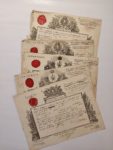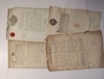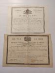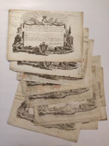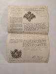 Eleonore Prince de Saint Mauris- Montbarey (2) et de Philippe Henry marquis de Ségur (8). 10 pp. in-folio oblong. Beaux décors allégoriques ; Certificat d'admission à la pension de récompense militaire, au bénéfice du « Sieur Nicolas Math ». Document gravé sur vélin, daté du 3 avril 1788, signé « Le Mal duc de Biron », 1 p. in-folio ; 2 beaux brevets, l'un de l'Armée Royale-Vendéenne d'Anjou au bénéfice de M. Cady, daté du 20 mai 1815, signé par le comte Charles d'Autichamp, le second de l'Armées Royales de Bretagne au bénéfice de M. Ferron, daté du 15 juillet 1815 signé par le marquis de la Boëssière ; 5 Congés militaires (4 « infanterie » et 1 « Dragon »), gravés avec annotations manuscrites, datés du 22 juillet 1775 au 20 février 1788. 5 pp. gd in-4 ; Passeport en partie imprimé, signé par Louis-Joseph de Bourbon, daté du 29 avril 1801, au bénéfice de M. Garnier ; Certificat imprimé, au bénéfice de M.Parini daté du 28 novembre 1775, signé par le duc de Gresvres ; Certificat en partie imprimé, daté du 10 avril 1779, autorise « de substituer en seu huit ou di pieds de barrierre au lieu de celle qui existe en bois à la suite de celle déjà établie devant sa maison sur le rempart de la rue Poisonnierre () signé par Antoine-Louis-François Lefevre de Caumartin ; Congé de licenciement au bénéfice de M. Daval , daté du 15 juin 1792, signé par Louis-Charles Hervilly.