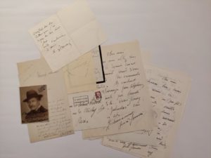 droit. Photographie par G.L. Manuel Frères (8,5 x 11,3) ainsi que 2 Lettres autographes signées, Tourcoing (s.d.) et (s.l.n.d.) 2 pp. in-8. De Tourcoing il s'excuse de ne pouvoir être présent « auprès de mes collègues du Jury » et (s.d.) correspondance amicale ; GOUNOD (Charles) Lettre autographe signée, (s.l.) 23 mai 83. 2 pp. in-12, il annonce «je ne dîne plus dehors : mais j'irai demain soir voir un instant ton père avec qui j'ai à causer de la lettre que j'ai reçu hier () » ; HAHN (Reynaldo) 2 lettres autographes signées à [Noel ou Etienne Charavay] (s.l.n.d.) 2 pp. in-4 et in-12 dont une sur papier de deuil. Il commande des autographes « Henri II » et « Lord Douglas 76770 » etc ; TOMASI (Henri) 7 Lettres autographes signées et une carte de voeux, à Monsieur et Madame Rivère, (Paris) datée de mars 1961 à fin décembre 1962, deux lettres s.d. 8 pp. gd. in-4 et in-12, 4 enveloppes. Correspondance rédigée entre mars 1961 et décembre 1962 dans laquelle il évoque ses différents travaux : il annonce le passage de ses oeuvres à la radio « Jabadao », « Le colibris », adresse ses voeux pour Noel et transmet le programme de La Maitrise, prévient de la création d'une nouvelle oeuvre « Silence de la mer » en février 1962. Le 11 avril 1962, Tomasi évoque ses répétitions à l'Opéra-Comique pour « Pauline, création le 25 mai. » Il poursuit avec sa santé « Coté oreilles, ça va lamentablement », le 28 décembre 1962, il annonce « Coup sur coup, le Grand Prix du Disque avec mes Noëls, Nana (ballet) en plein succès à Strasbourg () »
