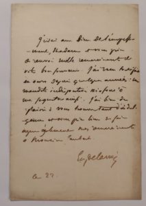 DELACROIX (Eugène) (1798-1863) Lettre autographe signée à Madame Jaubert (s.l.n.d. Le 22 [1853-1863]) 1 p. in-8. Il la remercie "(...) de votre bon souvenir. J'ai vécu tout à fait en ours depuis quelques années : une maudite indisposition ma...