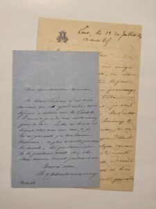 matin avec (M. Boiffelle). Il venait prendre mes instructions pour le soir () ». Joint : Une très intéressante lettre envoyée de Ems, 13 juillet 1870, 4pp. in-8°. Entête gravé « HA ». « () Je devrais pouvoir vous envoyer des nouvelles intéressantes, car nous nous promenons deux fois le jour tout au moins, avec un personnage qui a une importance toute particulière en ce moment, je veux dire avec S.M. Le Roi de Prusse. Mais bien qu'il cause beaucoup et avec beaucoup de personne, je ne sais rien de plus que ce que disent vos journaux, ainsi que quelques cancans locaux -tel que ceux-ci Bismarck arrive à 11h - Benedetti est arrivé hier - Tout le monde est ici bien surpris - Le Roi n'en revient pas - Ces français () fait une querelle d'Allemand ()] »