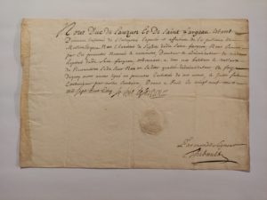 LAUZUN (Antonin Nompar de Caumont, comte puis duc) (1632-1723) Pièce signée, Paris, 29 mars 1705, 1 p. in-folio oblong. Sceau en cire rouge brisé, papier abimé. Nomination de Messire Jacques Nace, chanoine de l'église de St Fargeau, comme...