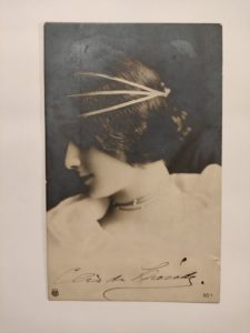MÉRODE (Cléo de) (1876-1966) Portrait carte postale, noir & blanc, signé au bas. 8,7 x 13,9 cm.