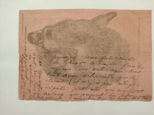 MICHEL (Louise) (1830-1905) Manuscrit autographe (s.l.n.d.) 1/2 page in-8 oblong au dos d'une représentation de la bête du Gévaudan (encyclopédie de l'enfance). Texte engagé de Louise Michel: «Pourquoi manifester contre le sénat ce serait...