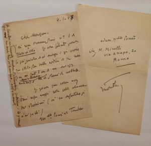 depuis la libération. Elle est pleine de noblesse » Il donne des nouvelles de Mathilde Pomès qui est tombée malade à Rome peu après son départ, Montherlant lui demande de lui écrire « seule et malade à l'étranger, le moindre signe d'attention du pays natal doit faire plaisir à une personne aussi sensible qu'elle ». Joint l'adresse de Melle Pomès 1/2p.in-8° signée.