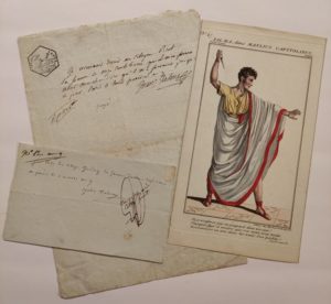 TALMA (François Joseph) (1763-1826) Billet autographe signé au citoyen Picot, Paris 8 prairial an 9 (29 mars 1801), 1/3 page in-4. Talma reconnaît devoir au citoyen Picot la somme de onze cents livres pour fourniture de marchandises. Joint: billet...
