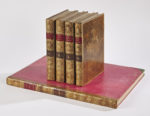 filet doré en encadrement, dos lisses joliment ornés, tranches mouchetées, et un atlas in-folio, demi-veau raciné à coins de papier vert, dos lisse orné de même, tranches mouchetées (Reliure de l'époque). Brunet III, 828 / Sabin 38960 /// I. (2f.)-LXXII-346-(1) / II. (2f.)-398-(1) / III. (2f.)-422-(1f) / IV. (2f.)-309. Édition originale illustrée d'un portrait-frontispice de La Pérouse gravé par Tardieu en tête du premier volume, et d'un atlas composé d'un titre gravé par Trière d'après Moreau le Jeune et de 69 planches numérotées dont 37 cartes et vues (une dépliante, 12 à double page et 14 à pleine page) et 32 planches à pleine page (faune, flore, scènes de vie, costumes, etc.). L'ensemble est dû à de nombreux graveurs parmi lesquels Tardieu, Choffard, Bouclet, Le Pagelet, Masquelier, etc., d'après des dessins de Duché de Vancy, Prévost, Blondela, La Martinière, etc. L'expédition commandée par La Pérouse, partie de Brest en 1785 à bord de La Boussole et de L'Astrolabe, fut l'une des plus ambitieuses de la fin du XVIIIe siècle. Elle avait notamment pour objectifs de compléter la cartographie lacunaire des côtes du Pacifique, d'établir de nouvelles routes maritimes et d'enrichir les connaissances et collections scientifiques. Après près de trois ans de navigation, les deux vaisseaux firent naufrage au large de Vanikoro. Le récit du voyage fut publié par Louis de Milet-Mureau d'après les documents confiés par La Pérouse à Barthélemy de Lesseps, interprète franco-russe de l'expédition rentré par la Russie en 1787-1788. Très bel exemplaire en reliure de l'époque tiré sur papier fort bleuté. Infimes frottements aux reliure, une carte roussie, une autre restaurée en pied et une mouillure angulaire au début de l'atlas n'affectant pas les planches.