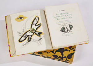 Jean-Henri FABRE Le Monde merveilleux des insectes. Sept tableaux tirés des Souvenirs entomologiques. Paris, Les Cent-Une, 1950. In-4 (25 x 32,7 cm), en feuilles, chemise et étui illustrés en rouge ou noir sur fond moutarde. Monod, I-4424 / Cent...