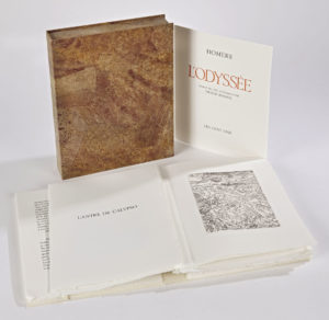 HOMERE L'Odyssée. Paris, Les Cent-Une, 1980. In-4 (25 x 32 cm), en feuilles, emboîtage en papier liège. Monod, I-6082 / Cent Unes, n° 30 /// (2f. bl.)-(6f.)-13 à 125-(4f.)-(1f. bl.). Extraits de L'Odyssée d'après la traduction de Victor...