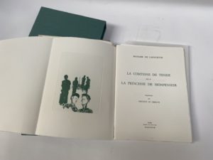 Madame de LA FAYETTE La Comtesse de Tende, suivi de, La Princesse de Montpensier. Paris, Les Cent-Une, 1988. In-4 (25 x 33 cm), en feuilles, chemise et étui. Cent Unes, n° 34 /// (2f. bl.)-(4f.)-9 à 74-(3f.)-(2f. bl.). 7 aquatintes hors texte de...