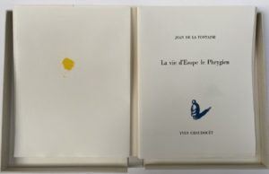 Jean de LA FONTAINE La Vie d'Ésope le Phrygien. Paris, Les Cent-Une, 1996. In-4 (25 x 32,5 cm), en feuilles, emboîtage illustré. Cent Unes, n° 38. L'ouvrage se compose de 11 cahiers dont 2 vierges et 9 imprimés au recto seul. Chacun des 9...