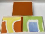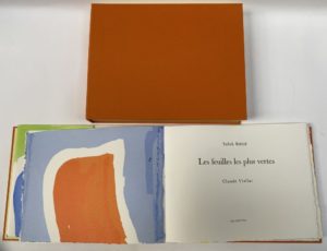 Stétié, "Les Feuilles les plus vertes" et "Rive Sud". 7 illustrations de Claude Viallat dont une grande aquarelle originale pour la couverture et 6 sérigraphies dans le texte dont le frontispice, 2 à double page et 3 à pleine page. L'aquarelle originale de la couverture couvre la totalité du dos, des plats et des remplis. Tirage à 125 exemplaires sur vélin de Rives signés par la présidente, l'auteur et l'artiste (n° XXVII).