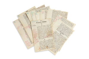 Bloy, abondamment annoté et commenté par Barbey d'Aurevilly. [Admirateur de Barbey d'Aurevilly, Bloy lui demanda dès 1867 à le rencontrer pour pouvoir le « contempler ». Barbey d'Aurevilly devina chez lui des dons et accepta de devenir son mentor, le conseillant dans ses lectures, sur son style, et lui instillant sa propre intransigeance de caractère. De son côté, Bloy lui servit un temps de secrétaire et s'employa à constituer autour de lui un groupe de fidèles. Malgré quelques brouilles, Bloy resta fidèle à Barbey d'Aurevilly et assista à ses derniers instants. C'est le buste de Barbey d'Aurevilly par le sculpteur Zacharie ASTRUC (1833-1907) qui inspira à Léon Bloy cette « sorte de poème fou », sa première tentative littéraire. Ce poème en prose est tout vibrant de l'admiration de Bloy pour le Connétable des Lettres. Bloy a réalisé une copie calligraphiée de son texte et des commentaires de Barbey d'Aurevilly, qu'il édita en une rarissime plaquette polygraphiée tirée à une douzaine d'exemplaires.] Le manuscrit de Léon Bloy est soigneusement mis au net à l'encre noire, avec quelques corrections marginales au crayon vert ; paginé au crayon bleu de [1] à 12, il est divisé en quinze parties (I-XV), et daté en fin « Août-Septembre 1875 ». Bloy a prévu une marge sur la gauche pour les « Observations de M. d'Aurevilly ». BARBEY D'AUREVILLY a porté en marge, à l'encre rouge, une quinzaine d'annotations ou commentaires, et 34 flèches signalant des passages remarquables ; il a également souligné dans le texte des mots ou des phrases, et proposé parfois des corrections. Bloy dit son admiration pour ce « buste méduséen » et pour « l'homme plus étonnant encore dont il est l'image. [...] Oh ! combien fière, imposante et redoutable, dans sa tranquille toute-puissance, nous apparaît cette étonnante physionomie ! [...] C'est le chevalier de Dieu, dans un monde sans Dieu et sans chevalerie, dans un monde expirant de vieillesse, au milieu de la foule des mondes moqueurs, harmonieusement balancés dans les espaces du ciel. C'est ce magicien de l'orthodoxie doctrinale et littéraire dont les philtres bienfaisants restituent la vie aux cœurs des poëtes découragés et rajeunissent les impressions intellectuelles du passé dans tous les esprits organisés pour vibrer à la grandeur. C'est le poëte et le critique à l'emporte-pièce et l'inépuisable sagittaire du trait vengeur. Catholique au milieu des incroyants, monarchiste après les monarchies, ligueur sans ligue, gentilhomme sans roi et roi lui-même sans gentilshommes et sans popularité, demeuré fidèle à des sublimités qui ne triomphaient pas, - c'est le porte-étendard et le porte-foudre de la Vérité et de la Beauté quand même. Destinée de héros et prédestination du Génie ! Double grandeur suprême, si la grandeur pouvait aujourd'hui compter pour quelque chose et si l'héroïsme et le génie pouvaient souffleter moins cruellement la délicieuse, la fière, l'enivrante égalité des temps modernes ! Certes ! je la connaissais bien cette grande figure audacieuse ! J'avais assez vécu, rêvé, souffert, pleuré devant elle ! Cet éducateur de mon intelligence avait assez passé sur ma destinée, à travers mon cœur, pour que, - venant un jour à tomber et à disparaître derrière l'horizon de ma vie, - je ne l'oubliasse plus jamais ! [...] Mais il fallait la Méduse-Astruc avec le tonnerre et le tressaillement surhumain de sa beauté, il fallait cette poussée du génie pour déchirer le bandeau de l'habitude et me contraindre à regarder, pour la première fois, - dans la lumière transfiguratrice de ce chef-d'œuvre, - sa face d'immortalité ! »... Etc. Les observations de BARBEY D'AUREVILLY sont remarquables : « C'est là un style que Buffon aurait appelé pour la manière dont il se meut et marche : des articulations de Lion. C'est membré & puissant de démarche. Chargé, oui, mais pas lourd. » (p. 1). « Tout cela est très grand, d'un beau tour poétique, - et byronien. Vous savez ce que cela est pour moi. - Ma parole, je trouve cela beau comme s'il ne s'agissait pas de moi [cette phrase a été omise dans la plaquette autographiée]. - Ce n'est pas ce que je suis, - mais c'est ce que je voudrais être. Gentilhomme sans roi, par exemple c'est ce que je suis. » (p. 3). « Le style, c'est la tournure, donnée par l'organisation. » (p. 4). « On sent le souffle lyrique qui vraiment est partout, et qui ne ballonne pas les joues pour souffler ! » (p. 8).... Etc. Et à la fin (p. 12) : « Grand avenir d'écrivain.... brassez, brassez, brassez !!! puisque vous avez ce biceps. »