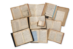 manuscrit du Journal intime de Léon Bloy, dans lequel il a consigné au jour le jour 26 années de sa vie, et où il puisera la matière des huit volumes de son Journal publié. De 1892 jusqu'au 20 octobre 1917, soit deux semaines avant sa mort, Léon Bloy a tenu régulièrement son journal intime, consignant minutieusement, dans des agendas ou almanachs, jour après jour, les moindres événements d'ordre personnel ou spirituel qui jalonnent la douloureuse existence du « Mendiant ingrat » : son travail d'écrivain, la naissance de ses enfants et leur éducation, ses déménagements épiques et ses domiciles successifs, son existence difficile, ses permanents soucis d'argent, ses amitiés, ses protecteurs, ses violentes colères et ses haines, sa foi religieuse et ses doutes, ses accès de mysticisme, ses réflexions sur les événements du jour et ses contemporains, etc. Il y a copié ou collé de nombreuses lettres envoyées ou reçues, les coupons des mandats, des coupures de presse... Il dresse, généralement à la fin des volumes, la liste des lettres envoyées et reçues, ainsi que ses comptes. Ces agendas sont remplis à l'encre noire, avec des notes ou traits aux crayons rouge, bleu ou vert. Léon Bloy va en tirer la matière des huit volumes de son Journal : Le Mendiant ingrat, Mon journal, Quatre ans de captivité à Cochons-sur-Marne, L'Invendable, Le Vieux de la Montagne, Le Pèlerin de l'Absolu, Au seuil de l'Apocalypse, et (posthume) La Porte des Humbles. I. 27 Janvier-31 Décembre 1892, dans un Agenda-Buvard du Bon Marché 1892 (29 x 19 cm) ; après la minute d'une lettre à Louise Read (27 janvier), la première entrée est à la date du 10 février ; le journal est tenu ensuite sans interruption. Citons l'entrée du 14 février : « Impossible d'aller aux Lazaristes. Visite de Landry à dix heures.
