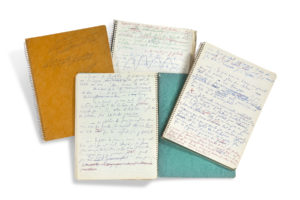 cahiers de travail pour Écartèlement (Gallimard, 1979). Écrits au stylo-bille bleu, parfois rouge, mais aussi quelquefois vert ou au feutre bleu, au recto des feuillets, avec quelques additions ou corrections sur les pages blanches en regard, ces cahiers sont abondamment raturés et corrigés. Ce manuscrit de travail, qui paraît même parfois de premier jet, est un premier état de ce qui deviendra, après élaboration et reclassement, Écartèlement. On trouve là, dans un ordre qui n'est pas encore celui du livre, quantité de pensées et d'aphorismes qu'on retrouvera dans les quatre sections des Ébauches de vertige, dans une version primitive, souvent surchargée de corrections. Sur la couverture du cahier II, divers titres ont été rayés : Les deux vérités / Les deux vérités / La fin de l'histoire / Le lecteur de mémoires ; puis Cioran a noté : Fluctuations II. Ce sont à peu près les titres des trois premiers chapitres d'Écartèlement : Les deux vérités ; L'amateur de mémoires ; Après l'histoire. Le cahier V porte sur la couverture cette note : « le précédent septembre 1977 [Juin 1978 biffé] ». Certaines pensées sont abondamment raturées et corrigées ; d'autres sont biffées ; d'autres sont marquées en marge par des croix, des points d'interrogation. Beaucoup seront très modifiées pour Écartèlement, et figurent ici dans une première version différente de celle du livre. Ainsi dans le cahier II, cette entrée : « Dans ce port normand, on vient d'attraper un gros poisson qui s'appellerait “Poisson de lune”, et qui aurait été entraîné par un courant chaud, car il ne vit pas dans ces régions. Étendu sur la jetée, il se secoue et se tord, puis se calme et ne bouge plus. Visiblement, il a abandonné le combat. Plus de “drame”. Comme on meurt bien si on a la chance de n'être pas homme ! » ; dans Écartèlement (Ébauches de vertige, IV), les trois dernières phrases seront remplacées par celle-ci : « Une agonie sans affres, une agonie modèle ». Citons, comme exemple du travail de correction de Cioran, cette entrée du cahier V, qu'on retrouvera avec des variantes dans la section III des Ébauches de vertige, mais qui est déjà ici surchargée de corrections aux stylos rouge et vert (les mots entre crochets ont été biffés ou correspondant à la première rédaction) : « À la frontière espagnole, [nous étions] quelques centaines de touristes, la plupart [scandinaves nordiques] scandinaves, [qui] attend[ions]ent devant la douane. On apporte un télégramme à une dame forte, visiblement ibérique. Elle l'ouvre et aussitôt se met à pousser des hurlements [dignes de sa constitution complexion. C'était sa mère qui venait de mourir, et nous venions d'assister à une de ces explosions] et à appeler sa mère dont elle venait d'apprendre le décès. [Elle a de la chance] Quelle aubaine pour elle, me disais-je, de pouvoir se décharger [immédiatement] aussitôt de son chagrin, au lieu de le dissimuler, [de l'étouffer,] de le stocker comme aurait fait n'importe lequel de ces blondasses qui la regard[aient]ent ahuris et qui, [par excès] victimes de leur discrétion et [par superstition de la] de leur tenue, [et de leur anémie,] [aboutissent traînent des névroses à longueur se ruinent chez le psychanalyste] [finiront par se ruiner chez le psychanalyste] [sombreront un jour dans la névrose] se ruineront un jour chez le psychanalyste ». D'autres pensées passeront dans Aveux et anathèmes (1987), comme celle qui ouvre le cahier III : « Un jeune Allemand, sur les bords de la Seine, me demande un franc. J'entre en conversation avec lui, et il m'apprend qu'il a couru le monde, qu'il est allé aux Indes dont il aime les vagabonds auxquels il pense ressembler. Cependant on n'appartient pas impunément à une nation... sérieuse. Je le regardai quémander ; il avait l'air de sortir d'une école de clochards. [La suite est biffée : Les Occidentaux, en général, quand ils se mettent à imiter l'Orient, ne font en réalité que déchoir : ils n'accèdent à un simulacre de sagesse qu'en s'encanaillant.] » D'autres semblent être restées inédites. Dans le cahier V, on trouve à deux reprises l'apostrophe : « Clio, je te hais ! », suivie sur un feuillet volant de cette note : « Clio, cette imbécile », qui deviendra dans le livre : « Abominable Clio ! ». Dans ce même cahier, Cioran a inséré, outre le feuillet ci-dessus cité, deux feuillets d'aphorismes dactylographiés, avec des corrections autographes ; et, en fin de cahier, deux feuillets autographes paginés a et b.