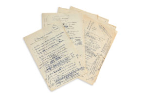 fi nal. rappelons que le matador espagnol Manuel MAnolete avait été tué lors d'une corrida en 1947. La dernière version présente encore deux ou trois variantes avec le texte publié dans Clair-obscur (1954). Le poème compte 7 quatrains. Le premier jet du poème est commencé au crayon puis poursuivi au stylo bille, abondamment raturé et corrigé, avec une dizaine de vers biff és pour ébaucher la dernière strophe (2 ff .). Puis vient une première mise en forme, au stylo bille, elle encore très corrigée et raturée (1 f.). Puis c'est une mise au net, bien calligraphiée, avec le titre L'Hommage à Manolete, datée « Barcelone 11 juillet 1953 », mais à nouveau raturée et corrigée ; en tête, Cocteau a noté « presque au point » (1 f.). La quatrième version est établie sur un double au carbone d'une nouvelle mise au net, signée et datée « Barcelone 14 juillet 1953 » ; Cocteau y a porté de nouvelles corrections au crayon et au stylo bille bleu ; puis sur deux feuillets supplémentaires, il élabore au crayon deux strophes supplémentaires (5 et 6), avec de très nombreuses ébauches raturées et corrigées (1+2 ff .). La version fi nale est encore un double au carbone d'une nouvelle mise au net du poème complet, avec quelques corrections au stylo bille (2 ff .). « Autre il fut. Autre était son titre de noblesse. Mercure avait muni ses pieds d'ailes. Aux boites A cigares pareil, d'or médaillé, la messe Sanctifi ait le pur crime de sa main droite »...