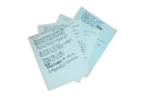 ELUARD Paul (1895-1952).POÈME autographe signé « Paul Eluard », La Justice n'est pas faiblesse, [1951] ; 3 pages et demie in-4 sur papier glacé bleu. Manuscrit de travail de ce poème en faveur des militants communistes emprisonnés en Grèce....