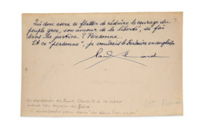 ELUARD Paul (1895-1952).MANUSCRIT autographe signé « Paul Eluard », [1949] ; demipage oblong in-8. Déclaration à la presse avant de quitter la Grèce. « Qui donc osera se fl atter de réduire le courage du peuple grec, son amour de la liberté,...
