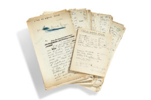 avec titre autographe signé et le cachet encre de l'Association des écrivains combattants (dos de la chemise en partie déchiré). Manuscrit de travail complet de cette longue nouvelle. Ce roman a été publié, comme « roman inédit », dans le numéro de juillet 1921 des Œuvres libres ; il sera recueilli dans Histoires de très loin ou d'assez près (Flammarion, 1923). Le manuscrit présente de nombreuses ratures et corrections ; « commencé le 18 décembre 1920 fi ni le 7 mai 1921 » ; des dates au crayon vert fi gurent en marge du texte, parfois avec des notes : « 4/2/1921 retour de Bruxelles », « Lyautey maréchal 20/2/21 ». Farrère a dédicacé son manuscrit : « pour ma femme Henriette Roggers », puis il a rayé la mention « ma femme » au crayon bleu. L'Île au grand puits raconte l'aventure de Lord Nettlewood et ses hôtes d'élite à bord du yacht La Feuille de Rose : ayant débarqué sur une pittoresque île déserte au large de l'Irlande, pour visiter son légendaire Puits de la Vérité, ils voient le yacht disparaître au large, emporté par une tempête. Alors des passions complexes, sentimentales et politiques, se déchaînent... Mais au petit matin le yacht est heureusement de retour... On joint 6 pages petit in-4 de notes autographes préparatoires, avec dessin à la plume d'une goélette : éléments du drame, titre primitif (Les Naufragés, corrigé), noms, qualités et âges des personnages...
