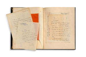 intérieur de maroquin bleu fi leté, étui bordé (René Aussourd). Correspondance au critique Paul Souday. Florence 10 avril 1913. Gide se réjouit de l'article de Souday dans Le Temps, [en réponse au sien, sur « Les dix romans français que..., NRF, avril 1913]. « Non, ce n'est point le point de vue réaliste qui me fait préférer la Cousine Bette (j'ai du reste faille inscrire Le Cousin Pons). Mais vraiment pouvez-vous préférer à une de ces deux œuvres d'architecture si magistrale l'informe Louis Lambert ou la désolante Séraphîta ! »... Il accepte Pantagruel, si l'on veut bien le tenir pour roman, et cite des œuvres de Voltaire, Diderot, Montesquieu, Sterne ; qu'est-ce que George Sand, « en regard de Georges Eliot ? »... 10 novembre [1914]. « Non, non, je ne suis pas un ingrat ! Mon premier mouvement, après avoir lu votre excellent article, avait été de vous en remercier »... Il pensait aller le voir, « puis la guerre est venue, culbutant tous les projets. Et si je vous écris aujourd'hui, enfi n ! ce n'est point que mes pensées aient repris leur cours normal, certes ! mais cette petite épine dans la conscience fi nissait par trop me gêner »... Cuverville 9 octobre 1916. Il félicite Souday de ses articles dans Paris-Midi. « Je suis bien amusé d'apprendre de quel exécrable histrion sont les deux vers que vous citiez. Est-il vrai, comme me le racontait Blanche, que Poincaré, à la suite de votre article sur “la hyène” vous aurait convoqué à l'Élysée pour vous rappeler au sentiment des convenances..? »... Il va écrire à Gallimard concernant le service de presse de la N.R.F. et des œuvres de Péguy ; la N.R.F. a été « profondément désorganisée par la guerre : la petite république que nous formions, où les éléments les plus divers se maintenaient en respect et en équilibre, s'est trouvée toute écartelée. Les décisions que d'abord nous prenions toutes en commun [...] sont aujourd'hui prises par un seul - et certainement si cet état se prolongeait, notre forme devrait être changée »... Mardi matin. « Je m'attristerais réellement que vous vous sentissiez blessé par une pointe sans venin, et pussiez considérer comme inamicale ma boutade. Je pensais que vous en souririez »... D'absurdes et abominables attaques ont rendu Souday sensible sur ce point ; Gide ne fait nullement chorus avec elles. « Si, comme je le souhaite, nos relations se resserrent un peu, je vous montrerai certaine lettre indignée que j'écrivais à Maurras, à votre sujet »... Cuverville 13 mai 1918. Il doute que Souday interprète comme il faut l'exclamation entendue au sujet de la vente de DEGAS : il l'attribuerait plutôt à l'un des amis et admirateurs de Degas, désolés de voir livrer au public des croquis et brouillons que l'artiste aurait voulu détruire. Il cite l'extrait d'une lettre reçue de l'« un de ceux qui ont le plus intimement connu Degas, et l'ont le plus vénéré : “Désastre. L'exposition Degas. C'est une trahison. La famille a accroché tout, tout ! Quand on songe qu'il avait projeté de confi er à X le soin de fi ltrer son atelier, de brûler beaucoup, de ... Le gâtisme est venu ; on lui a fait tous les testaments qu'on a voulus et, mort, il a subi tout ce qu'il avait détesté : la collection vendue, les brouillons exposés et mis aux enchères” »... 28 novembre 1921. Au retour d'Italie, il a pris connaissance de la « judicieuse réplique à l'article de Strowsky », et il souhaiterait voir l'article sur « la reprise des relations intellectuelles avec l'Allemagne »... 30 avril 1925. Il lui sait gré « du peu d'humeur que respire une rectifi cation dont vous m'avez fait reconnaître la justesse », et qui est bien présentée : « Pour un peu je me féliciterais d'avoir provoqué une explication que seuls les sourds volontaires resteront à ne pas entendre - si j'étais bien assuré que du même coup vous y avez purgé tout votre ressentiment contre moi. Au surplus vous parlez de mon petit livre [Caractères] avec une bienveillance charmante »... 14 juillet 1927. Lettre sévère, à la suite de plusieurs articles d'incompréhension : « Vous me prêtez des pensées qui ne sont pas les miennes, des opinions que je n'ai jamais eues, des sentiments, des intentions, avec une générosité telle, que je m'essouffl e à vous suivre, et me garde de protester. Mais, pour trois lignes de moi qui vous chatouillent, vous vous récriez longuement [...] que signifi e cette hostilité persistante, qui du reste n'éveille aucun écho dans mon cœur. Vous vous trompez en croyant que je la mérite ; oui, plus encore que dans tous les jugements extra-littéraires que vous vous plaisez à porter sur mon œuvre »... Bellême 2 août 1927. « Évidemment je sens, à travers vos critiques, vos attaques même, une sorte de considération, que votre dédicace veut bien accentuer, et à laquelle je n