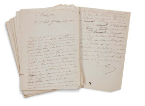 homme d'État anglais. Cette biographie a été recueillie dans Portraits et Biographies : William Pitt, lord Chatham, Mme Roland, Charlotte Corday, volume paru le 19 novembre 1865 à Paris, chez A. Lacroix, Verboeckhoven et Cie, 1865. La première page porte en tête la rubrique « Le Civilisateur », titre de la revue éditée par Lamartine de 1852 à 1854 et sous-titrée « Histoire de l'humanité par les grands hommes », à laquelle était donc destinée cette étude. Le manuscrit est paginé de 1 à 67 avec des incohérences (2 ff. 10, et 2 ff. 65 ; le texte passe ininterrompu de la p. 16 à la p. 18) ; sur une quinzaine de pages, Lamartine a collé des pages ou des fragments de texte imprimé, correspondant à une notice probablement découpée d'une édition de la Biographie universelle de Michaud, et à des pages détachées des Mémoires des dix dernières années du règne de Georges II d'Horace Walpole (Dentu, 1823). Lamartine, ancien député, ancien ministre et ancien candidat à la présidence de la République, sous guise de retracer la vie du grand homme d'État britannique William PITT (1708-1778), livre ici un vibrant éloge de l'orateur. « De toutes les facultés littéraires de l'homme celle qui se confond le plus avec l'action c'est l'éloquence politique ; c'est pourquoi de tous les hommes de lettres ceux que l'histoire range le plus souvent au rang des grands hommes sont les orateurs. On n'est pas un grand homme en effet pour être simplement un grand philosophe, un grand poète, un grand écrivain, car ces dons ou ces talents de l'intelligence quoique possédés à un degré éminent par les favoris de la nature ou de l'art ne supposent pas toujours les qualités d'âme, de caractère, de puissance sur les événements, de vertu publique, qui constituent le grand citoyen, le grand guerrier, le grand tribun, le grand conseiller politique de son pays. Mais l'orateur politique confond à la tribune son âme avec son éloquence, son caractère avec ses paroles, son génie d'homme d'état avec son discours, son patriotisme avec ses idées, et souvent même son sang avec ses opinions. Il n'y a que du talent dans l'écrivain il y a de l'héroïsme dans le grand orateur. Écrire c'est écrire, mais parler c'est agir, combattre, gouverner, quelquefois mourir »... Citons aussi la conclusion de cette Vie : « Les grandes paroles sont les mères des grandes choses. Le beau dans le discours est le diapazon du beau dans l'action. Dégrader l'éloquence c'est dégrader l'âme de l'auditoire. L'orateur est le poète du peuple délibérant ; si l'orateur est trivial et cynique vous avez Clodius Cromwell ou Marat demandant des têtes à des barbares ; si le poète est lettré et philosophe vous avez Chatham Vergniaud ou Lanjuinais demandant des modérations et des vertus aux citoyens. N'abaissez pas la voix des tribuns car ce serait abaisser le patriotisme et les vertus des nations. » PROVENANCE Archives LAMARTINE, château de Saint-Point.