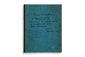 (les ff. 40-48 et 51 vierges), dont 35 pages autographes de Morand et 13 avec dessins de Laurencin ; sous chemise-étui de papier gaufré de gris bleu, dos percaline bleue avec titre. Brouillon du premier roman de Paul Morand, illustré de dessins de Marie Laurencin. Lewis et Irène, commencé en 1922, fut achevé l'année suivante à Athènes ; publié dans la Revue de Paris les 1er et 15 décembre 1923 et le 1er janvier 1924, il paraît chez Bernard Grasset en janvier 1924. C'est le premier roman de son auteur, qui n'avait publié auparavant que trois recueils de nouvelles. Cette publication marque également son départ des éditions Gallimard pour les éditions Grasset (ce qu'illustre un amusant dessin). Le personnage d'Irène Apostolatos est en partie inspiré par la princesse Hélène Soutzo, fille et sœur de banquiers grecs, que Morand épousera en 1927. Ce roman, qui restitue avec bonheur les « Années folles », remportera un grand succès ; il met en scène la rivalité amoureuse d'un riche banquier, homme pressé, et d'une femme d'affaires moderne, leur mariage puis leur séparation ; Morand a écrit que Lewis et Irène aurait pu se nommer « les Jeux de l'amour et de l'argent ». Sur la couverture du cahier, Morand a inscrit : « Premier brouillon de Lewis et Irène commencé en 1922 sur ce cahier prêté par Marie Laurencin. Paul Morand ». Plus tard, il ajoute : « Ce début a été écrit le soir, 19 rue de Penthièvre, dans l'appartement de Marie L., qui devint le mien l'année suivante. P.M. ». Au revers de la couverture, quelques notes sont écrites principalement par Marie Laurencin (dont l'adresse de Robert de Rothschild). Au fil du cahier, on relève 13 dessins originaux ou croquis de Marie LAURENCIN : - portrait de jeune en buste (f. 2, pleine page, mine de plomb, crayons noir et de couleur ; peut-être le portrait d'Irène Apostolatos, l'héroïne du roman) ; - sirène empanachée (f. 3, pleine page, mine de plomb et crayons de couleur) ; - deux bouquets de roses et de tulipes (f. 6, pleine page, mine de plomb et crayons de couleur) ; - jeune femme lisant une lettre, et esquisse de tête auréolée (f. 7, pleine page, mine de plomb) ; - deux chiens se poursuivant (f. 8, tiers supérieur de la page, texte de Morand en dessous, esquisse à la mine de plomb) ; - buste de jeune fille encapuchonnée (f. 9, mi-page supérieure, texte de Morand en dessous, mine de plomb et crayons de couleur) ; - jeune femme à mi-corps, les mains derrière la nuque (f. 10, pleine page, mine de plomb et crayons de couleur, annoté : « Tulle / Jour échelle) ; - jeune femme allongée sur un fauteuil, mains derrière la nuque (f. 11, pleine page, esquisse mine de plomb) ; - jeune femme à mi-corps, de face, et esquisse de tête (f. 12, à mi-page, perpendiculairement au texte écrit, mine de plomb et crayons de couleur) ; - deux jeunes filles en buste (f. 13, à mi-page, esquiise à la mine de plomb) ; - esquisse hachurée (f. 49v°, mine de plomb) ; - chien couché et femme allongée, bras tendu (f. 50v°, esquisse mine de plomb) ; - cinq jeunes femmes en tenue de bal, dont une masquée (f. 52v°, pleine page, avec 10 lignes de Morand, mine de plomb). Ce manuscrit offre la première esquisse de ce qui deviendra le roman Lewis et Irène. Morand a rédigé son manuscrit au crayon, au recto des feuillets, laissant intacts les feuillets portant un dessin à pleine page de Laurencin, mais écrivant quelquefois sous les dessins ou esquisses occupant le haut de la page. Il est tracé d'une écriture cursive, sans marge, avec quantité de ratures, corrections et additions (parfois notées sur la page en regard). Les pages sont inégalement remplies, souvent entièrement, mais parfois avec de grands blancs, ou avec seulement quelques lignes ; Morand a paginé son manuscrit jusqu’à la page 24 (f. 30). Le roman est déjà divisé en trois parties, avec deux « Deuxième partie » (I p. 1-12, II p. 13-22 et p. 23-f. 35, III f. 36-38), qui ne correspondent pas, sauf le début, avec le découpage final ; la troisième partie est abandonnée après deux lignes du chapitre II. Le héros s’appelle d’abord Damien : le nom de Lewis n’apparaît qu’à la page 23 ; son secrétaire-confident (Martial dans le roman) se nomme Élie. Les trois premiers chapitres correspondent au roman, dans une première rédaction présentant d’importantes variantes. Citons le début : « Les journaux du matin annonçaient un temps couvert, avec averses locales, suivies d’une dépression atlantique. Pour les contredire la matinée présenta un ciel de Sèvres, intact vers lequel montèrent les haleines et l’encens des tapis battus. / – 15 fit D. / C’était le 1er enterrement d’oct