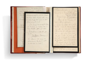 dos conservés, les lettres montées sur onglets ou sur papier vélin fort, le tout relié en un volume demi-maroquin rouge à coins, tête dorée. Édition originale posthume, tirée à 535 exemplaires, un des 25 sur Vergé d'Arches (non justifié) à grandes marges. Exemplaire de Jean ROYÈRE, qui réalisa cette édition, enrichi d'une belle correspondance littéraire de John-Antoine NAU. John-Antoine NAU, premier Prix Goncourt en 1903 pour Force ennemie, est alors en Corse, et écrit à son « vieux frangin » Royère qui sera son exécuteur testamentaire (42 pages in-8 la plupart sur papier deuil, et 4 au dos de cartes postales illustrées). Les lettres sont écrites de Zicavo et Portovecchio de septembre à décembre 1910 ; une est signée « Giovanni-Antonio Navetti », et une autre « Adolphe Brisson [avec signes maçonniques] dit John Antoine Nau ». Il y est beaucoup question de La Phalange, de la collaboration de Nau à cette revue et à divers quotidiens, de l'éventuelle publication d'un roman chez Grasset (Cristobal le poète), et surtout de leurs contemporains René Chalupt, Félix Fénéon, André Fontainas, Judith Gautier, Gustave Geffroy, Gérault-Richard, Valery Larbaud, Marius-Ary Leblond, Jules Lemaitre, Charles Morice, Jacques Rivière, Alfred Vallette, Léon Werth, etc. 7 septembre. Sur ses travaux : Autre âge ingrat, En suivant les goélands (recueil dédié à Royère) ; il recommande vivement son « demi-compatriote », Stuart Merrill, « un délicieux garçon que j'aime beaucoup [...] il a beaucoup de talent et exècre les Américains presque autant que je le fais. Du reste, tous les Américains propres abominent les Yankees. Il y a longtemps qu'il existe comme poète »... 21 septembre. En bon révolutionnaire antirépublicain et « ci-devant », il voudrait « essayer de tomber » la Gazette de France : « je ne suis pas content et emmerde tous mes contemporains sauf toi et les tiens. (Exceptons aussi Fénéon, Rivière et quelques autres, comme ce cochon de Guy Lavaud qui ne me répond jamais quand je lui écris) »... 3 novembre. Citation de vers admirables de Royère, dont un, « miraculeux », « digne de Baudelaire » : « Amour, ô mort blottie en une chair qui passe ! »... 30 novembre. Il est heureux que son bouquin paraisse en prépublication dans La Phalange ; hommage à cette revue « toujours littéraire et qui compte J. Royère, Vielé-Griffin et Jammes parmi ses poètes, sans oublier Guy Lavaud et Chalupt, les meilleurs parmi les jeunes »... 7 décembre. Éloge de Des fleurs, pourquoi de Lavaud ; il aimerait glisser dans la revue dix lignes « d'un royalisme gris et éteint » en faveur de Quelques propos d'un contre-révolutionnaire de Guy Chardonchamp... 28 décembre. « Très bien les quelques mots que tu réponds à ce ... postérieur de Clément Vautel. Il n'est même pas capable d'être venimeux, ce gigolo, mais il est outrageusement bête ! »... Etc. On a monté en tête du volume 2 photographies originales de Royère se recueillant sur la tombe de Nau, au cimetière de Tréboul, et à la suite de la correspondance, 3 enveloppes autographes à Ange Toussaint-Luca, plus une carte postale représentant la tombe de Nau.