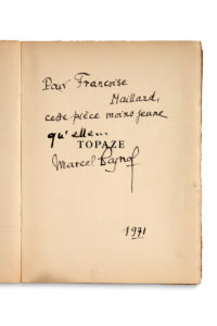 Sacha GUITRY. Envoi autographe signé inscrit postérieurement sur le faux-titre : « Pour Françoise Maillard, cette pièce moins jeune qu'elle... Marcel Pagnol 1971 ». Topaze, premier succès théâtral de Marcel Pagnol, fut créé au Théâtre des Variétés en 1928