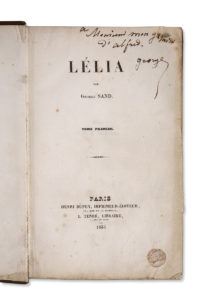 fi lets dorés et ornés de fl eurons, tête dorée (reliure fi n XIXe siècle) ; étui-boîte maroquin crème en forme de livre par G. Huser. Édition originale. Précieux exemplaire off ert par George Sand à Alfred de Musset au début de leur liaison, avec un double envoi. Tome I: 4 ff . n. ch. (faux-titre, titre, dédicace et épigraphe), 350 p. Tome II : 3 ff . n. ch. (épigraphe placée par erreur avant le faux-titre, titre,), 383 p. (les p. 209 à 225 remplacées par une copie manuscrite) et 1 f. bl. Cet exemplaire est enrichi de deux envois autographes signés, sur chacune des pages de titre. Sur le premier tome on lit : « à Monsieur mon gamin / d'Alfred. / George » ; sur le second : « A Monsieur / Monsieur le Vicom[te] / Alfred de Musse[t] / hommage respectueux / de son dévoué / serviteur / George Sand ». Cet exemplaire témoigne des tourments de la liaison orageuse de Sand et Musset. Ce dernier a en eff et collé, dans le tome I, le faux-titre au titre pour cacher l’envoi de son ancienne maîtresse. Il a également arraché quelques feuillets. La gouvernante de Musset, Adèle Colin Martellet, a relaté, dans son Alfred de Musset intime, souvenirs de sa gouvernante (F. Juven, 1906), la raison de cette mutilation : « À ce dernier tome, seize pages sont arrachées, ce sont les pages 209 à 225, où George Sand décrit une scène d’orgie où tout le monde paraît dans un état voisin de la folie, où le personnage de Sténio est bafoué et joue un rôle répugnant. […] J’ai supposé que M. de Musset, lisant, longtemps après, avait voulu retirer de ce livre le passage peu intéressant qui lui déplaisait. Il avait aussi collé la dédicace du premier volume avec deux pains à cacheter qui sont encore visibles ». Les pages supprimées ont été remplacées par 6 feuillets manuscrits lors de la reliure. Émouvant témoignage d’une des plus célèbres liaisons amoureuses de la littérature française du XIXe siècle. Bel exemplaire, agréablement relié, dans un excellent état de conservation (quelques minimes frottements sur les nerfs et les coiff es) ; intérieurs très frais, de rares rousseurs éparses, marques de cachets de cire posés par Musset qui avait scellé la page de dédicace du premier volume. Petit manque angulaire au premier feuillet de dédicace avec le mot « g[amin] » refait. L’envoi du 2e tome légèrement rogné par le relieur. Étui cassé. PROVENANCE Alfred de Musset ; Jacques Guérin (20 mars1985, n° 90) ; Paul-Louis Weiller (30 novembre 1998, n° 143). EXPOSITIONS Alfred de Musset (Bibliothèque nationale, 1957, n° 91) ; George Sand. Visages du Romantisme (Bibliothèque nationale, 1977, n° 135). BIBLIOGRAPHIE Carteret, II, p. 306 (exemplaire cité).