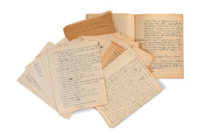 des carnets et des feuilles volantes . Sans s'être astreint à tenir régulièrement son journal, Raymond Queneau s'est livré, durant plusieurs périodes de sa vie, à cet exercice qui répondait à un besoin épisodique et a revêtu des formes variées. Journal intime, auquel il confie les aléas des sentiments et du désir, des convictions et des opinions, avec une volonté de lucidité constante que l'on retrouve dans ses étonnants récits de rêves, soigneusement consignés de 1928 à 1932 ; journal littéraire bien sûr, mine d'informations sur la vie éditoriale et artistique, du mouvement surréaliste à la nébuleuse Gallimard ; mais aussi memoranda, itinéraires, citations, notes de lectures, avec parfois de petits croquis... Loin d'opérer dans le genre littéraire exploré par les Goncourt ou Gide, Queneau tenait plutôt une sorte de carnet de bord, « un témoignage de franchise » (écrivait-il en 1930), à usage personnel. Les notes prises au jour le jour ont parfois été mises au net, dans un mouvement rétrospectif : ainsi, le journal que le lycéen a tenu au Havre de l'âge de 13 à 20 ans, nous est connu par le Journal du Havre, recopié dans un cahier en 1923, et en partie dactylographié (et corrigé) dans le Journal d'un jeune homme paüvre (1920-1927). Les récits de rêves (1928- 1932) ont été consignés au jour le jour, avec un système d'encres de couleur pour différencier les rêves de leur interprétation. Les cahiers et carnets du « Journal de guerre » (1939-1940) ont été revus par Queneau qui en a supprimé des passages aux ciseaux. À partir de 1949, Queneau a opté pour un système de numérotation continue de ses notes. Nous avons tenté de présenter ici au mieux ces éléments disparates, en renvoyant à l'édition des Journaux établie par Anne Isabelle Queneau (Gallimard, 1996, 1240 p.) [ J], certains éléments étant cependant restés inédits. A. Journal du Havre (1914-1923). Cahier cartonné in-4 (21,6 x 17 cm) relié toile beige, papier ligné. 117 ff. autographes à l’encre noire plus 1 f. détaché inséré. Le début du manuscrit, soigneusement mis au net, a été rédigé par Queneau d’après des notes prises au cours des années précédentes, probablement en 1917 (sur la première page, Queneau a fait ses comptes : « Résumé du 1er Trimestre 1917 », resté inédit ; il évalue sa bibliothèque à 569 F). Il a continué à tenir son journal à la suite. Ce Journal est commencé au Havre le 15 avril 1914, poursuivi à Paris, à Épinay et au cours de ses différents voyages (en Angleterre, en Alsace, à Grenoble...) jusqu’à la dernière entrée le 26 avril 1923. [J 11-115]. Un feuillet inséré raconte le voyage à Grenoble au début d’octobre 1922 [J 102-103], avec quelques variantes, un plan et quelques notes inédites. B. Journal (1923-1927). Manuscrit autographe, 68 ff. paginés postérieurement 1-83 (les pages 1-27 sur feuillets de cahier d’écolier in-4, la suite sur divers formats (dont des feuillets de petit carnet), du 26 juillet 1923 à 1927 [J 115-148]. Quelques passages sont restés inédits, dont (p. 67) deux courts récits de rêves les 3 et 5 avril 1927, et un paragraphe biffé (p. 82) sur Dieu et la pauvreté : « Dieu, c’est le mot favori des barques abandonnées où gémissent la monotonie des repas ordonnés qui pèsent comme des bouchers la petite dose d’espoir laissée la veille sur la table de nuit. [...] ces mangeurs de cervelas et ces bouffeurs d’hostie bardent de billets de banque leurs poches tachées de la sueur de leur travail ou de leur bassesse. Je ne comprends pas la valeur de l’argent et ce que signifient la richesse ou la pauvreté »… C. Le Journal d’un Jeune Homme Paüvre (1920-1927). Tapuscrit corrigé, 85 ff. in-4 (27x 21 cm) dactylographiés, comportant de nombreuses additions et corrections autographes à l’encre, avec des béquets collés. Sous chemise portant le titre autographe : « Le Journal d’un Jeune Homme Paüvre (1920-1927) », un second titre en lettres capitales (Journal d’un Paüvre Jeune Homme corrigé) avec la mention biffée « dix-sept à vingt-quatre ans », et l’épigraphe « Hélas quel paüvre jeune homme / Plus tard je suis devenu (Chêne et chien) ». Ce tapuscrit reprend, à partir du 18 mai 1920, le texte du Journal du Havre, jusqu’en avril 1923 (ff. 1-46), puis le texte des manuscrits du Journal jusqu’au 27 novembre 1927 [J 65-149]. On joint une copie dactylographiée (double carbone) du Journal, du 17 avril 1920 au 27 novembre 1927 (86 ff. in-4, quelques découpes aux dernières pages). D. Notes autographes (1917-1939). – Journal (28-29 novembre [1919]), fragment découpé, différent du texte édité [J 43]. – Page de cahier d’écolier inédite portant le titre « Journal depuis le 12 novembre 1920 », avec ép
