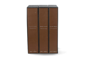 QUENEAU Raymond.NOTES autographes de lecture et de travail, [vers 1930-1950] ; environ 600 pages formats divers, montées sur onglets sur des ff . de papier vélin, le tout relié en 3 forts volumes in-fol., dos en cuir brun gaufré, 3 rubans de...