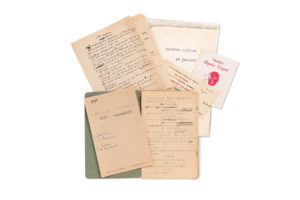 dans le n° 8 de la revue L'Arbalète ; la pièce fut créée en avril 1947 au théâtre Agnès Capri, par la compagnie Masques nus, dans une mise en scène de Pierre Gout, devant un décor photographique de Brassaï, en « lever de rideau » du drame de Luigi Pirandello La vie que je t'ai donnée. La pièce de Queneau, se déroulant dans un couloir de métro, présente deux actes symétriques, dont les personnages et les péripéties se répondent deux à deux. Tonalité poétique dominante, humour verbal qui évoque le théâtre de l'absurde, cette pièce se rattache aux thèmes de l'incommunicabilité et des rêves impossibles. Le manuscrit, à l'encre noire, comprend 48 pages provenant de deux cahiers, conservé sous une couverture de cahier gris-vert Student Book : le premier acte (25 pages) sur papier ligné (22,5 x 14,6 cm), et le « 2ème tableau » (23 pages) sur papier de cahier d'écolier à grands carreaux (22,5 x 17,6 cm). Il présente de nombreuses et importantes ratures, corrections, suppressions et additions, à l'encre ou au crayon, avec notamment une dizaine de pages biff ées ; ainsi que de nombreuses variantes avec la version publiée, notamment le prénom de l'héroïne Irène qui deviendra Odile. Un feuillet de titre à en-tête de la nrf présente le titre primitif biff é « Un invité », remplacé par Un passant, avec deux couples de personnages : « Joachim / Le Passant » et « Irène / La Mendiante ». On joint l'invitation à la générale et le programme du Théâtre Agnès Capri ; plus une photocopie de la publication en revue.