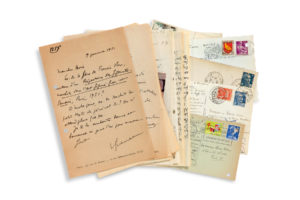 QUENEAU Raymond.22 L.A.S. « Queneau » ou « R. Queneau », dont 10 au dos de cartes postales illustrées, 1947-1958, à Boris VIAN ; sur 22 pages formats divers, nombreux en-têtes nrf, 10 adresses (trous de classeur à la plupart). Correspondance...