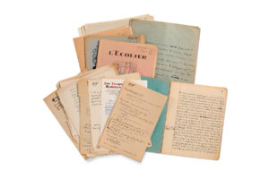 voyous fut publié en janvier 1951 dans Les Temps Modernes (n° 63, pp.1193-1205), et devait être suivi d'une seconde partie qui ne parut jamais ; le texte fut repris en volume chez Gallimard, en 1986, à la suite du Journal 1939-1940. Queneau brasse ici toute l'histoire tumultueuse des relations entre les philosophes, de Platon à Kierkegaard, et les voyous, de Diogène à Vidocq, montrant qu'en réalité il n'est pas facile de les distinguer : « Car si le voyou est voyeur, et s'il court les rues, s'il “circule partout”, qu'est-ce qui peut le différencier du philosophe ? » Cet article à la fois excessivement érudit et follement drôle est une contribution décalée à la philosophie « existentialiste » de l'époque. Le manuscrit de premier jet est contenu dans 2 cahiers formant 42 pages petit in-4 (22 x 17 cm), à l'encre noire, le premier à couverture verte titré « f et V. 1 » (p. 1-12), le second à couverture rose de la marque L'Écolier, titré « Philosophes et Voyous 2 » (p. 13 à 42). Il présente de nombreuses corrections, additions dans les marges, et modifications. Il s'agit d'une version de premier jet, correspondant en partie à la version publiée, avec de nombreuses variantes, ainsi que des développements non retenus dans le texte définitif. Nous en citons le début : « Une bonne partie de la drôle de guerre, je l'ai passée dans un dépôt, avec des rebuts de l'armée française : infirmes, invalides, incapables, communistes, anarchistes, oubliés, cinglés, égarés. On y buvait beaucoup, du vin rouge principalement. On y avait de larges loisirs, comblés par le sommeil, les parties de cartes et l'école buissonnière. Je prenais une part active à toutes ces occupations, notamment pour ce qui était de la consommation du vin rouge. Que je fusse intellectuel, cela stupéfiait mes camarades. L'un d'eux me demande un jour ce que je faisais dans la vie ; embarrassé, je lui réponds : professeur (c'était pas vrai) ; de quoi ? De philosophie (pas vrai, non plus, mais enfin : j'ai un diplôme, une licentia docendi). Ah ah. Le camarade me toise avec sympathie et, se souvenant des bons kils de gros rouge que nous avions vidés ensemble, conclut : c'est vrai, je l'avais toujours pensé que tu étais un philosophe. Cette remarque me confirma dans l'idée que j'avais commencé à me faire de ce que pouvait bien être un philosophe »... Tapuscrit corrigé (12 pages in-4, 27 x 21 cm), avec de nombreuses corrections et additions autographes, donnant une version intermédiaire avant la publication en revue. Y est jointe une note dactylographiée sur papier à en-tête Les Temps modernes : « N.D.L.R. Cette première étude sera suivie, dans quelque temps, d'une seconde, où notre collaborateur examinera notamment le cas du philosophe chrétien et définira, en contraste avec ces différentes sortes de frivolité, les conditions de l'activité sérieuse ». Notes préparatoires et brouillon ; environ 60 pages de différents formats. * 2 cahiers petits in-4 (22 x 17 cm) à couvertures bleu pâle et rose sable, titrés « f et V », comportant 24 pages en partie rédigées, certaines laissées à l'état de notes, avec citations d'ouvrages, passages biffés, etc. ; plus une trentaine de pages de formats divers (dont de petits morceaux de papier ou une carte de visite), contenant des notes et remarques. Citons cette note : « le philosophe veut séduire, pas le voyou qui est séduisant en soi : la “propagande” / le baroque, la peinture séductrice des Jésuites / la “Joie” de Staline / la “Paix” des communistes actuels ». * 6 pages in-4 sur papier vert, au verso d'une dactylographie, d'un brouillon de rédaction avec corrections : « Le fric, et accessoirement l'amour, passent pour les deux principales causes du malheur des hommes ; lesquels sont, en général, en mauvais condition (humaine) »...