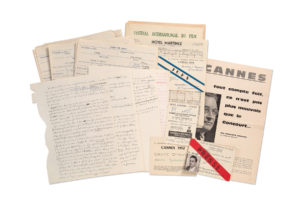 autographes par Queneau (1 p. in-4 en partie imprimée chaque), donnant ses appréciations sur chacun des fi lms vus. Sur Deux sous d'espoir de Roberto Castellani qui remportera la Palme d'Or ex-aequo avec Othello d'Orson Welles : « Enfi n ! Du cinéma intelligent, vivant, humain. Deux ou trois passages ont de la grandeur et ce n'est pas prétentieux » ; quant à Othello : « number one ». Un Américain à Paris : « Excellent fi lm de music-hall » puis il ajoute : « à la réfl exion c'est même beaucoup mieux que cela, c'est un événement dans l'histoire de la danse au cinéma ». Il se montre sévère avec Fanfan la Tulipe : « Ça aurait pu être un fi lm agréable, mais le dialogue gâche tout » ; quant à Gérard Philipe : « pas bon, cette fois-ci ». Viva Zapata d'Elia Kazan : « Le début et la fi n sont admirables. Le milieu, mou ». Umberto D de Vittorio de Sica : « Excellent. Un peu long. Un peu mince aussi (le sujet). Du très beau cinéma quand même ». L'Appel du Nil d'Youssef Chahine : hélas ! » Parfois, il est plus concis : « Zéro », ou « non ! non ! non ! » Etc. * 5 pages de notes autographes sur les délibérations du jury. * Manuscrit autographe, [1964] (3 pages in-4). « Je ne vais pas à Cannes et je n'ai pas l'intention d'y aller »... Il revient, douze ans après, sur cette expérience : « lorsque j'étais juré, je n'ai pas trouvé que c'était la foire (ou si peu), mais bien une foire où on trafi que comme dans les foires. Comme à Lyon, à Milan, c'est fait pour ça : le commerce que qu'ça marche. Et puis il y a aussi l'art. Orson Welles a eu le Prix. Il y a tout de même de quoi être fi er. Il y a du bon malgré tout dans tout ça ». On joint le tapuscrit, et un extrait de La Cinématographie française de mai 1964 où a paru ce texte. * Documents divers : carte de presse, carte de membre du jury, notes d'hôtel, programme annoté, règlement du festival...