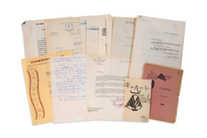 cartons d'invitation) : rêveries cinématographiques de Raymond Queneau, ébauches de projets dont une liste de « sujets italiens coproductifs » : « Goethe en Italie (Mignon), Shelley en Italie et sa mort, Stendhal en Italie » ; idées de plans : « Homme. Muraille sur fond blanc, se déplace. Orchestre éparpillé dans une salle », « Cinéma. Une balance. Le vent. Une auto, le capot ouvert » ; des idées de gags : « Paysans bretons folkloriques dansant le boogie-woogie et Nègres jouant de la cornemuse ». ; deux petits croquis, dont un représentant un balayeur. Photocopies d'un scénario dactyl. sans titre (1929-1930), avec traduction du début en allemand et en anglais, dans l'esprit surréaliste. « Rapport sur le scénario de Saint-Exupéry Igor » : tapuscrit (5 p., 2 ex.) ; correspondance de la production, Union générale cinématographique : 4 l.s. (1954-1955), plus 2 doubles dact. de réponses. 10 L.S. de producteurs dont 6 par Pierre Braunberger des Films de la Pléiade (et 9 télégrammes), 1954-1961, concernant divers projets cinématographiques, ou invitant Queneau à des projections. 3 L.S. par les productions cinématographiques I.T.S. concernant la postsynchronisation française par RQ du chef-d'œuvre de Fellini, La Strada (1955). Lettres à R. Queneau à propos de La Loi des rues (de Ralph Habib, 1956) : 7 L.S. de Paul Graetz (ou en son nom) de la Transcontinental Films, plus un double de réponse : problèmes avec la censure, participation de Queneau pour refaire la fi n du fi lm. Correspondance pour le doublage du Tour du monde en 80 jours, Ariane et Certains l'aiment chaud (1957-1959) : 11 lettres de la Société Parisienne de Sonorisation (et un double de réponse). Le Chant du styrène (Alain Resnais, 1958, Queneau en écrit le commentaire) : 2 L.S. de Pierre Braunberger (Les Films de la Pléiade) à R. Queneau. Note de lecture sur le scénario de Faibles femmes (1958) : 1 p. in-12 de notes manuscrites ; tapuscrit (3 pp.) ; 3 l.s. de la Transcontinental Films, plus un double de réponse. Synopsis dactyl. (1 p. in-4) sur l'aviation (avec lettre de demande de Cinévision, 1958). L.S. « Q » avec additions autographes approuvant l'adaptation cinématographique des Fleurs bleues par Barbara Alberti et Amadeo Pagani (1967). L.S. de Marcel Jullian au sujet de son fi lm avec Michel Boisrond On est toujours trop bon avec les femmes, d'après le Journal intime de Sally Mara (1971, et 4 doc. sur un autre projet d'adaptation de Sally Mara en 1969). On joint : 2 contrats signés pour l'adaptation radiophonique de Peter Ibbetson (1948-1949) ; un petit dossier autour du Festival du fi lm maudit à Biarritz (1950 : documents, coupures de presse, télégramme de Jean Cocteau) ; 3 documents concernant la nomination de Queneau au jury du Fonds de développement de l'industrie cinématographique (1955) ; 3 documents, dont un amusant dessin, concernant un tournage au Mexique (1955) ; un ensemble de 58 lettres ou pièces autour du prix Jean Vigo (la plupart L.S. de Claude AVELINE, 1956-1961) ; 7 lettres concernant le jury du Prix du Chevalier de La Barre (1958-1960) ; télégramme concernant le jury de la compétition du fi lm expérimental à l'Exposition universelle de Bruxelles (1958) ; 6 convocations au Conseil d'administration de la Cinémathèque française (1958-1961) ; nomination à la Commission consultative du cinéma (1960) ; une l.a.s. d'André Heinrich (avec photocopie d'un scénario) ; tapuscrit de notes du Journal de Queneau concernant le cinéma.